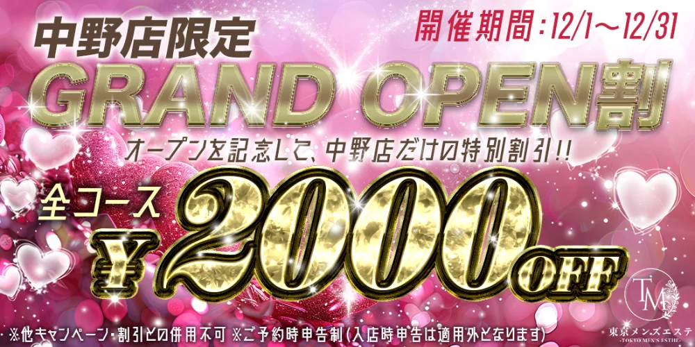 - 東京メンズエステ待望の中野店が12月GRAND OPEN!新たな癒しの空間で、厳選セラピストによる極上の時間をぜひご体感ください。